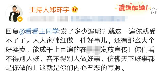 郑环宇最后义正言辞地说到:“发了多少遍呢?就这一遍你就受不了了。人人家韩红做一件好事儿,还有那么大个好买卖,能成千上百遍的在社交平台发放宣传!你们看不得别人好,容不得在线电影院别人做好事,仿佛天下好事都是你做的!这就是你们内心丑恶的写照。”