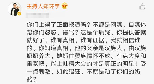 在看到一名叫做“贼叉”的知名科普大V作者质疑韩红是不是藏族后,郑环宇也突然现身,并反问道:“她原来不是藏族人?”郑环宇补充道:“谁有真相,谁有证据,我就相信谁的。你知道真相,他的父亲是汉族人,由汉族奶奶养大,她抓住藏族情怀不放。有点大度和幽默吧,能上吐槽大会的才是真正的明星!受一点刺激,如此猖狂,不就是动了你们的奶酪?”
