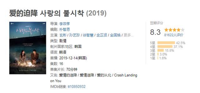 虽然相比于想见你的评分,爱的迫降目前只有8.3分,但是对于这部剧的评价也是很不错的,而且观看的人也是非常多的。
