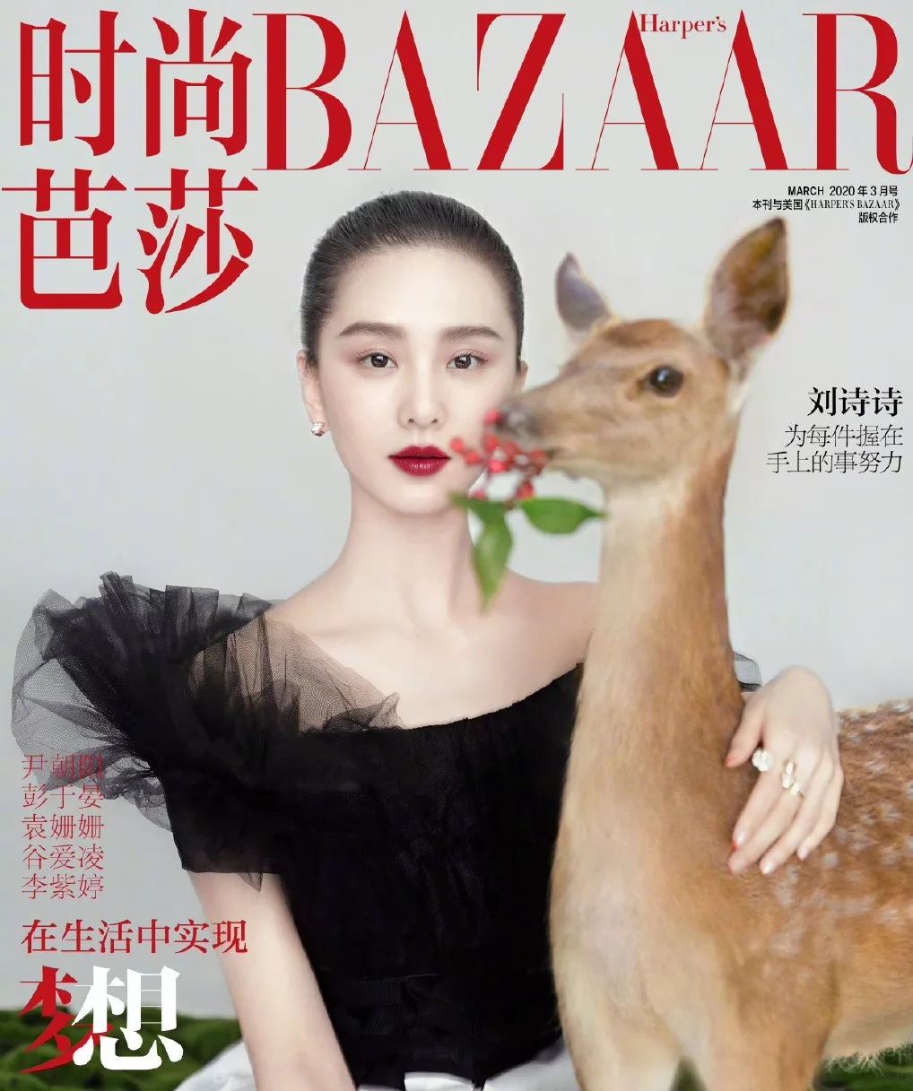 在杂志上,她以标志性的丸子头和天鹅颈登陆了《时尚芭莎》3月刊,还是难得的双封。