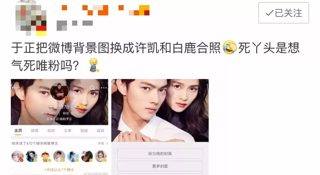 虽然于正这条维护吴谨言的微博没多久就删掉了,但现在又再次被自家的旗下艺人打脸。网友不想磕的cp,于正就亲自下手撮合例如许凯和白鹿。网友力证的cp,于正却发了狂似的澄清,实在是让人哭笑不得。