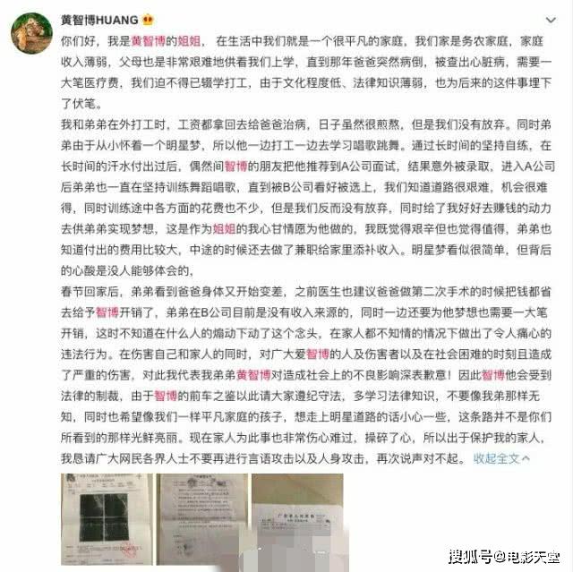 就在黄智博被推到风口浪尖上的时候,他的姐姐于昨日晚在微博发声表示家人此前并不知情,自己家是务农家庭收入薄弱,爸爸心脏病需要大笔医疗费,姐弟俩被迫辍学打工,但弟弟有个明星梦,在公司没有收入来源,开销同样很大,弟弟不知道在什么人的煽动下动了诈骗的念头,代替黄智博跟大众道歉,并呼吁网友不要对家人再进行言语和人身攻击。