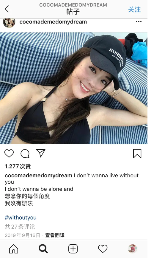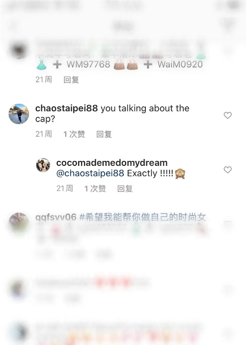 赵元同再次在下面发内涵评论:“you talking about the cap?”(你在说你的帽子?)林千又则回复说“准确!”其实我们从林千又发文来看,那句英文明明是情话我不想离开你,我不想一个人。赵元同明知是什么意思,还在下面这样抖机灵,打情骂俏无疑了。