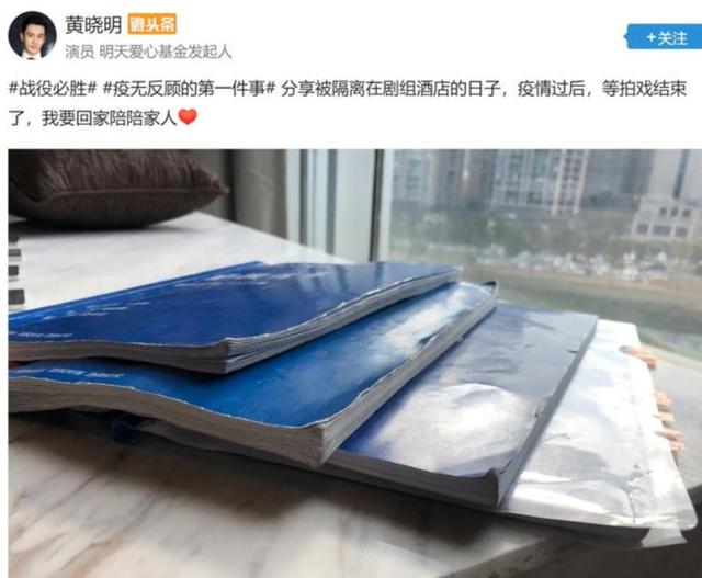 黄晓明就在个人社交平台发文“被隔离在剧组酒店的日子,疫情过后,等拍戏结束了,我要回家陪陪家人”。
