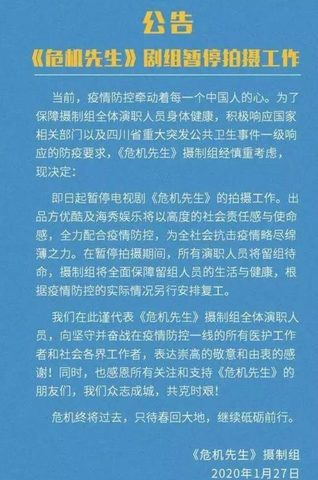 据悉,黄晓明本来是在拍摄《危机先生》,在1月27日的时候,剧组发布了暂停拍摄公告。不过整个剧组并没有选择“就地解散”,而是采取了就地休息后进行“封闭隔离”管理。