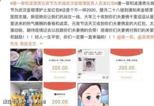 自从唐一菲和凌潇肃参加了某节目后,两人的一举一动都备受关注。近日,唐一菲和凌潇肃在某节目中透露在自己家的三位亲人感染了的情况下,他们仍然在大年三十给武汉金银潭医院的医务人员送吃的物资,还往返跑了好多趟。据网友爆料他们夫妻俩还给医护人员发了红包,但是没有在节目上说。这夫妻俩的暖心举动,圈了不少路人粉,网友们纷纷为他俩点赞。