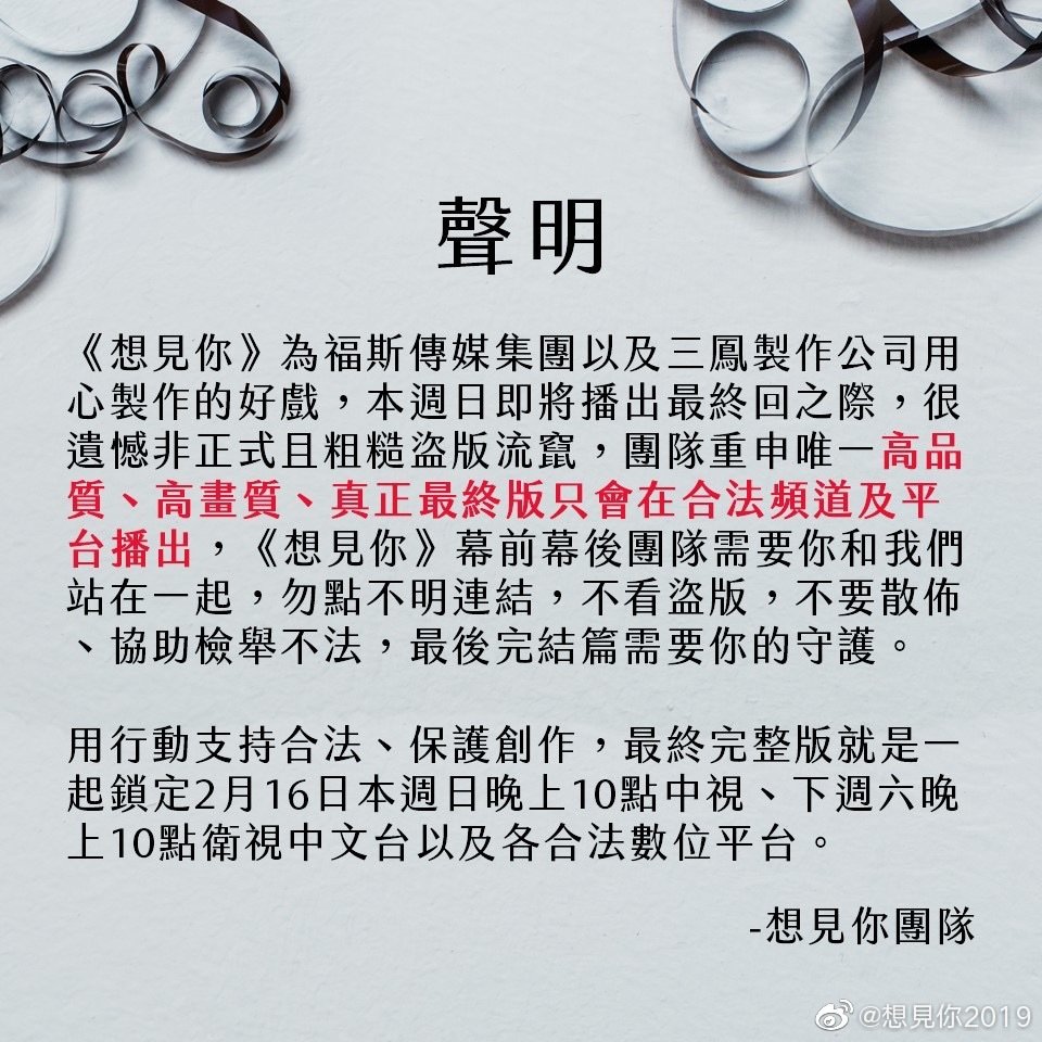 这已经不是第一次热播剧盗版资源流出,像《亲爱的,热爱的》《庆余年》《锦衣之下》等热播剧均经历了热播时期盗版资源泛滥的情况,树立版权意识已经成为了重中之重。《想见你》不论剧情还是演员的演技都称得上是优,希望大家拒绝盗版,和凤南小分队一起等待本周末的大结局吧!