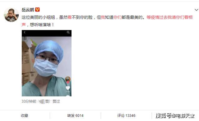 今日凌晨1点钟岳云鹏对这位医务工作者的短视频,进行了发文回应:"这位美丽的小姐姐,虽然看不到你的脸,但我知道你们都是最美的,等疫情过后我请你们看相声,想听啥演啥!"并配上这位医务人员的一张截图。