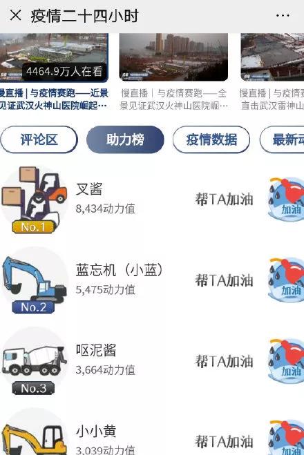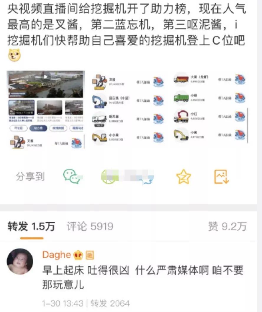 并且央视直播间还给挖掘机们发起了助力打榜的活动,在线打call,看这架势,像是追星女孩儿们的功劳。