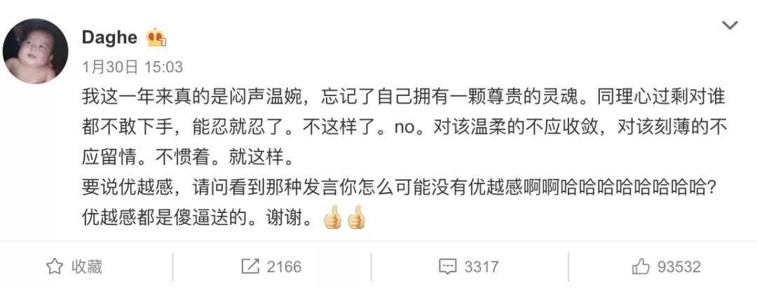 数次隔空教训网友,颇有一种“众人皆醉我独醒”的调调。
