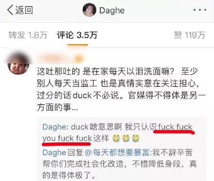 网友反驳说大家每天监工是真情实意在关注担心,过分的话duck不必说,结果就是这么一个“duck”彻底惹怒了姜思达,“duck”谐音就是“大可”,姜思达明显揣着明白装糊涂,回怼说自己不认识duck,给这位网友回了一堆fuck。