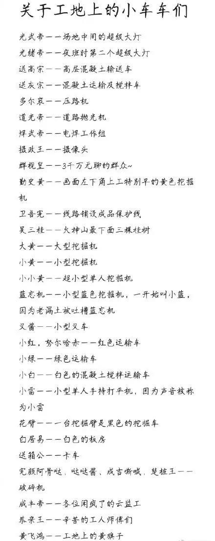 大家闲着没事,就开始找事儿干,围观直播的时候给工地上的挖掘机、搅拌机、压路机、小叉车…各种设备起了不同的昵称:什么叉酱、送灰宗、摄政王、多尔衮、小黄、大黄、挖挖机。