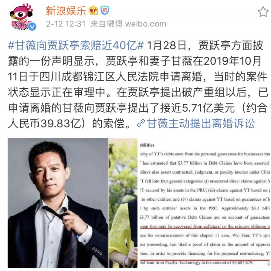 近日,据贾跃亭方的一份文件显示,贾跃亭在2019年10月11日在四川成都锦江区人民法院申请离婚。而在贾跃亭提出了破产重组后,甘薇向贾跃亭提出了近40亿元人民币的索赔,如此天价的离婚费,真是刷新了大家对这两人的认识。