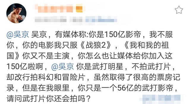 飞龙对吴京表示:“吴京,有媒体称:你是150亿影帝,我不服你,你的电影我只服《战狼2》,《我和我的祖国》你又不是主演,你怎么也让媒体给你加入这150亿啦啊,吴京,你是武打明星,不拍武打片,却改行拍科幻和冒险片,虽然取得了很高的票房记录,但是在我眼里,你只是一个56亿的武打影帝,请问武打片你还会拍吗?”