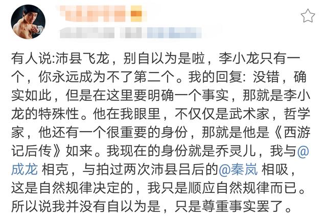 随即,飞龙就外界对自己的身份质疑进行了解释:“有人说:沛县飞龙,别自以为是啦,李小龙只有一个,你永远成为不了第二个。我的回复: 没错,确实如此,但是在这里要明确一个事实,那就是李小龙的特殊性。他在我眼里,不仅仅是武术家,哲学家,他还有一个很重要的身份,那就是他是《西游记后传》如来。我现在的身份就是乔灵儿,我与成龙相克,与拍过两次沛县吕后的秦岚相吸,这是自然规律决定的,我只是顺应自然规律而已。所以说我并没有自以为是,只是尊重事实罢了。”