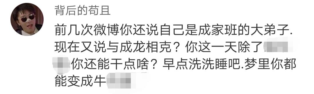 对此,网友们纷纷留言抨击道:“废聋,你是86版西游记里小钻风。被猴哥一棒敲死那个”、“前几次微博你还说自己是成家班的大弟子,现在又说与成龙相克?你这一天除了扯淡你还能干点啥?早点洗洗睡吧,梦里你都能变成牛”、“我……竟然无言以对”、“用不着你服不服,你算个什么东东?京哥都不稀得理你”、“56亿够你用一生仰望”、“真不好意思大家 我是沛县精神病院的主治医师,都怪我没叫人看好他 又跑出来乱吼乱叫希望没吓到你们,以后我会严加看管的”。