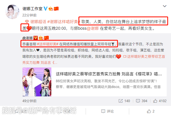 10月29日,谢娜发微博提到了自己另一个新节目《这样唱好美》,表示这个节目在网络热播值和播放量双双夺冠,似乎也是想证明自己的业务能力还是相当不错的,不然主持的节目也不会受到大众喜爱,也从而用数据回击那些说她主持不行的人。