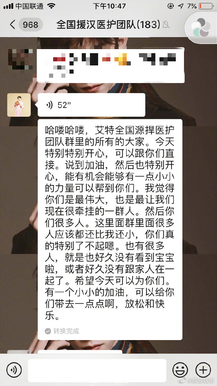 除了小岳岳承诺给前线的医护人员演相声外,谢娜也空降了武汉医院的支援群,在群里发了大段的语音消息给大家加油打气,升级为妈妈的谢娜似乎更加温暖和感性,希望能通过自己的语音给大家带去一点点的放松和快乐。
