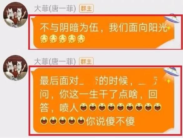 2月12日,唐一菲在粉丝中的部分对话流出,其中就有“不与阴暗为伍,我们面向阳光”这样的话语,似乎是在说自己懒理外界的质疑,问心无愧,就不在乎别人对她的看法。