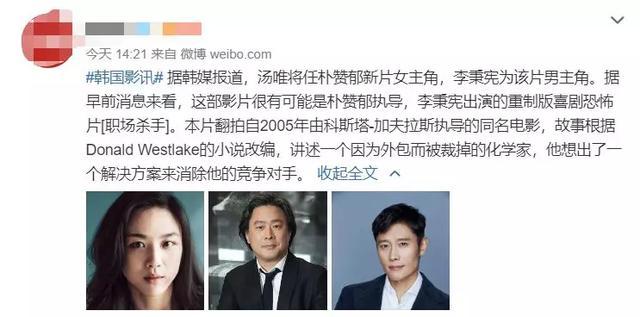 2月6日,据韩媒报道,在多位相关人士的透露下中国女演员汤唯将出演本国导演朴赞郁新作,该新片男主则有望由李秉宪担任。