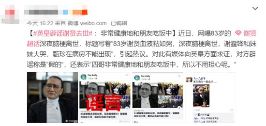 他俩的感情也是一直很低调,多少媒体都在等着他俩的新闻,但是谢霆锋和王菲就是不会满足媒体的愿望。不过到今天网上还是充满着对他俩的各种恶意,好在谢霆锋和王菲,特别是王菲从来就不会在意好评和恶评。只是最近对谢家有关的造谣真的是有点恶毒了,除了儿子不放过,有人居然还对谢霆锋的父亲谢贤也不放过!近日,网曝83岁的谢贤深夜脑梗离世,标题写着“83岁谢贤血液粘如粥,深夜脑梗离世,谢霆锋和妹妹大哭,甄珍在病房不能出现”,引起热议。对此有媒体向英皇方面求证,对方辟谣称是“假的”,还表示“四哥非常健康地和朋友吃饭中,所以不用担心呢。”