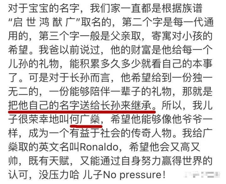第一个就是新晋豪门媳妇奚梦瑶的儿子何广燊,因为奚梦瑶的儿子是赌王的第一个男孙,意义很大,所以赌王和自己名字里的最后一个字“燊”送给了这个长孙。
