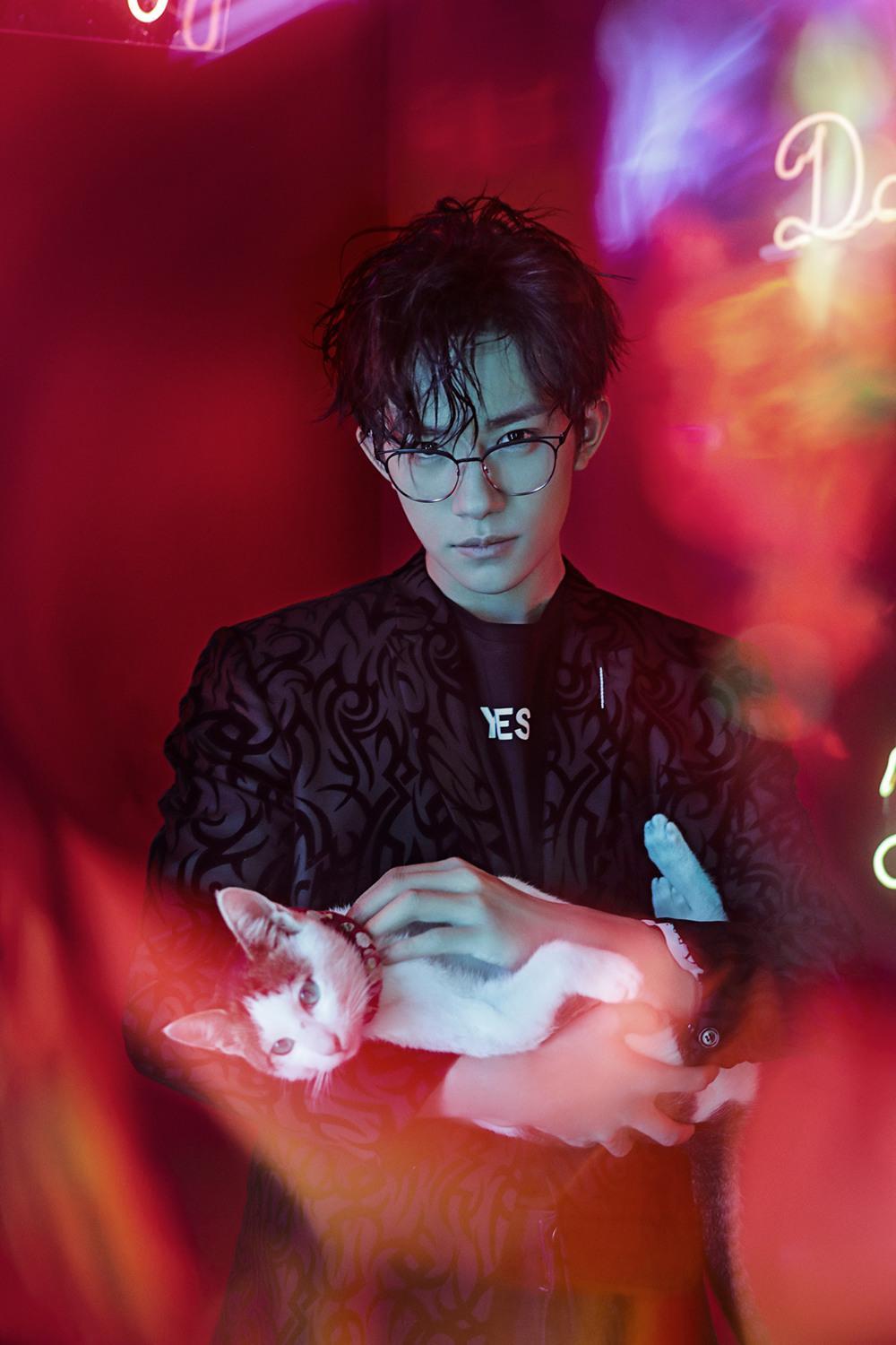 在近几年的时尚大片中,千玺的造型能力和对镜头的掌控能力越发出色。凌乱的湿发,搭配上暗紫色的花纹西装,站在红色的光影中,展现出少年少有邪魅的一面。整体的暗色调和华中浅色的猫星人对比,时尚质感完美的表现了出来。