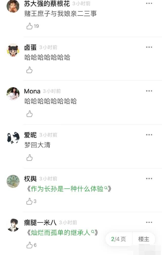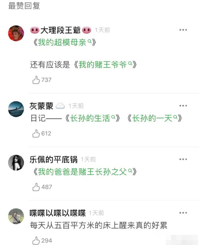 《我的赌王父亲》、《我的超模母亲》、《长孙的生活》、《我的爸爸是赌王长孙之父》、《赌王家族的二三事》、《超模妈妈告诉我的事》、《我的赌王N房父亲》、《我的四房奶奶》、《灿烂的遗产》、《豪门的秘密》、《1岁的我和99岁的爷爷》等等,乍一看都是些霸道总裁文,网友真的太有才了,写到这里小编笑出了猪叫。