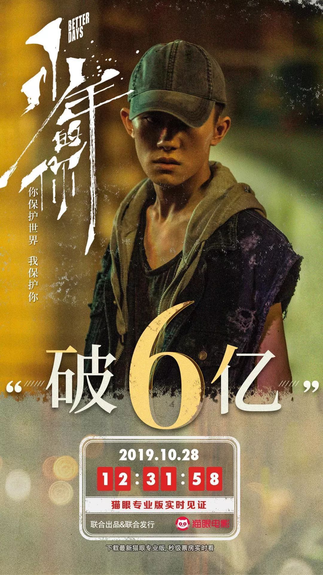 10月25日凌晨一点半不到,《少年的你》预售票房破亿,10月25日下午四点四十四,首日票房正式宣告突破亿元大关,目前总票房已破6亿。