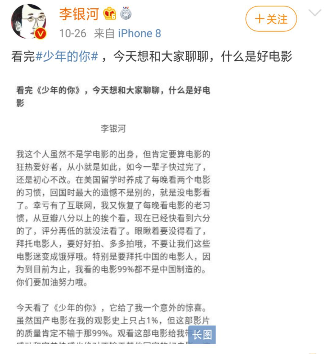 著名社会学家李银河更是大赞《少年的你》,称“要是没看《少年的你》就错过了一次美好的审美体验,你就不会知道中国的电影现在已经好到了什么程度”。