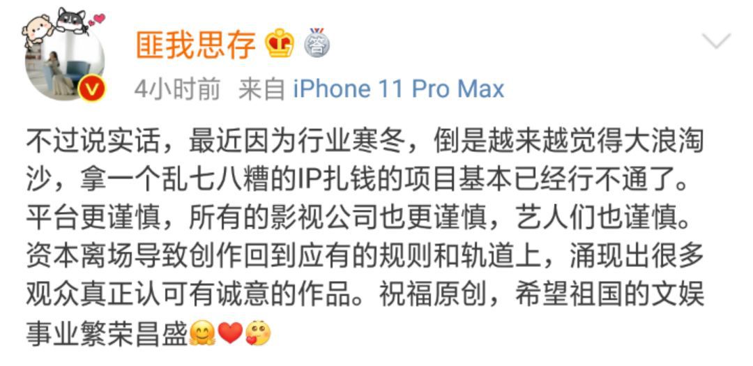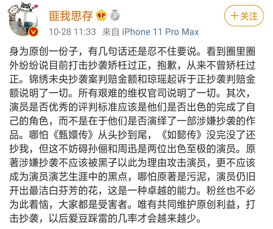28日中午,曾经被《甄嬛传》原作者流潋紫抄袭过的作家匪我思存对此事发声,认为“演员不应该因为一部涉嫌抄袭的作品就受到打击”。