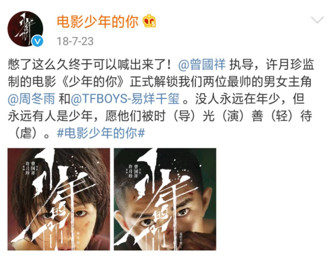 2018年7月官宣后,作为“顶流”易烊千玺的首部大荧幕作品,加上金马影后周冬雨与《七月与安生》的导演和监制再次合作,《少年的你》本身就让观众充满了好奇和期待。