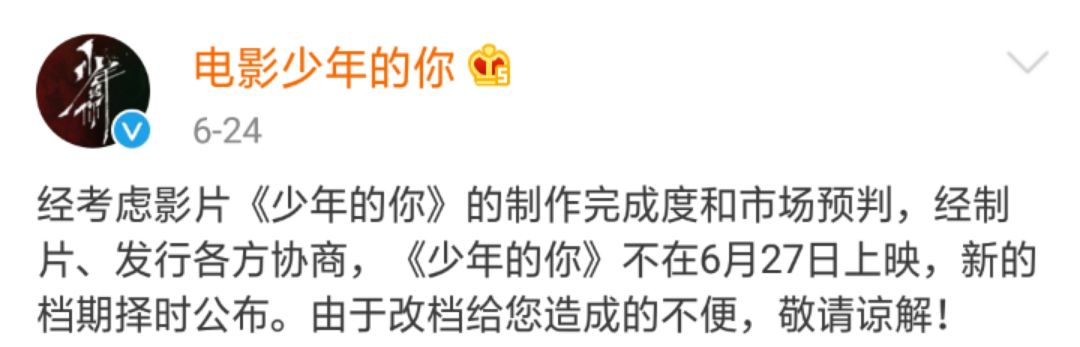 今年5月官宣定档6月27日之后,又在上映前三天突然宣布撤档。