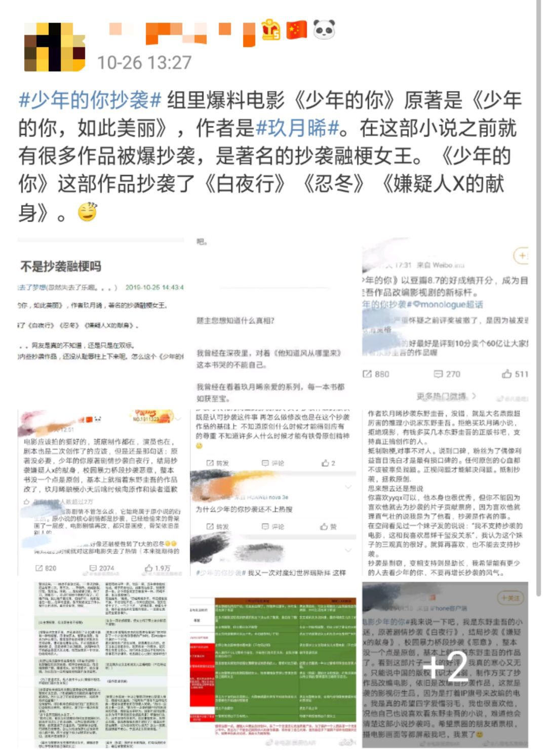 然而,有网友爆料《少年的你》的原著《少年的你,如此美丽》涉嫌抄袭《白夜行》《忍冬》《嫌疑人X的献身》,更有部分网友做出了调色盘。
