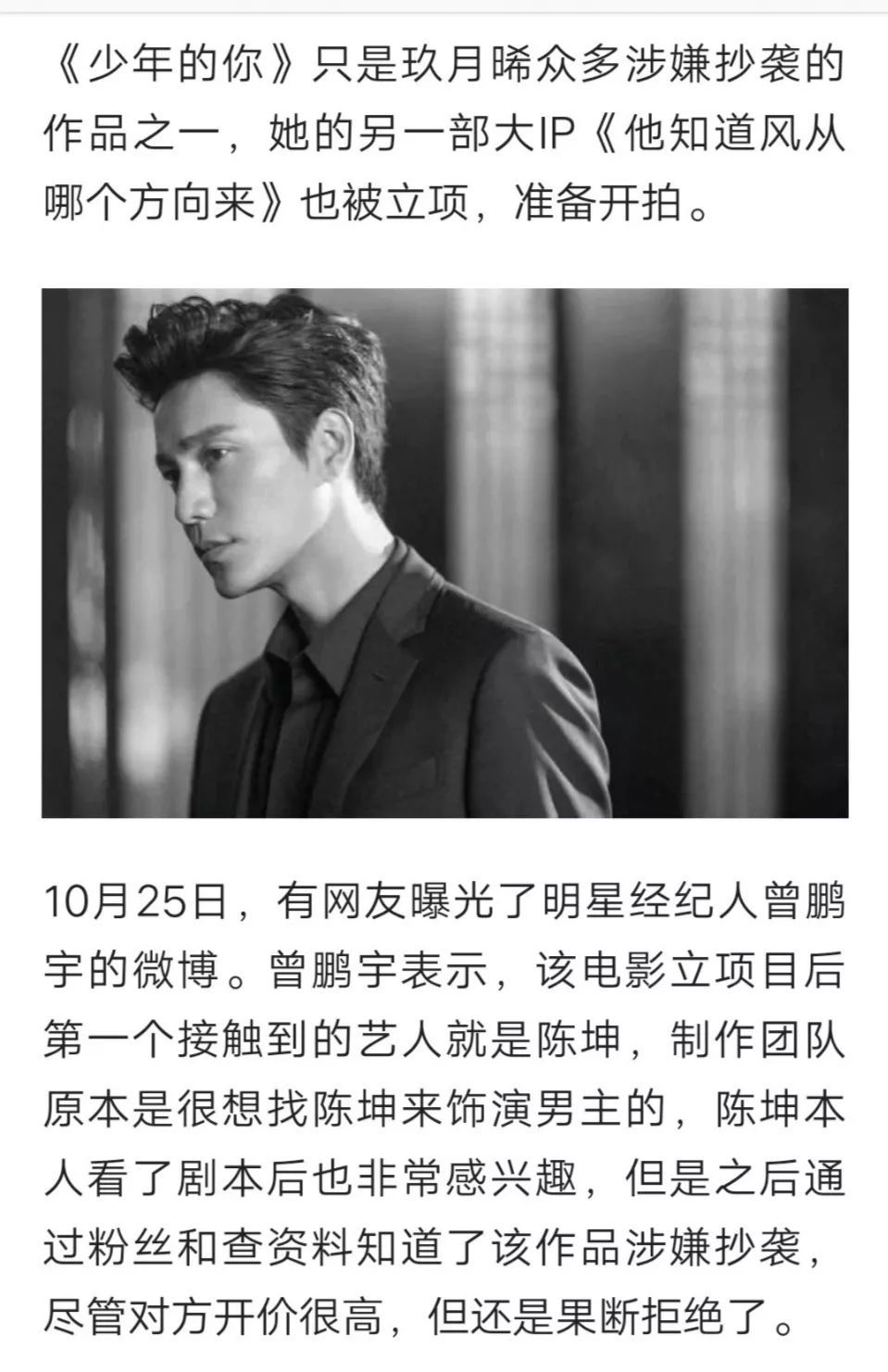 有网友质疑,易烊千玺和周冬雨为什么要出演这部涉嫌抄袭的作品,更将因抄袭问题而拒绝出演玖月晞另一部大IP电影的陈坤与易烊千玺和周冬雨对比。