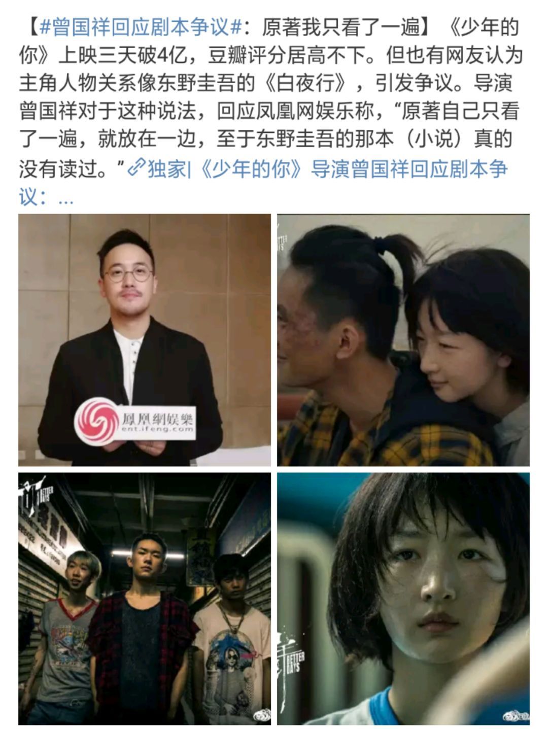 而《少年的你》导演曾国祥回应剧本争议时,称“原著我只看了一遍,至于东野圭吾的那本真的没有读过”。