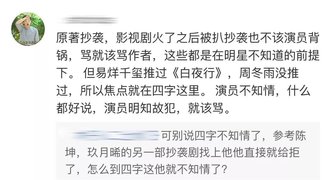 针对《少年的你》的抄袭风波,有网友认为“剧本问题,与演员无关”,但也有网友认为“演员在不知情的情况下出演可以理解,但明知故犯就无法理解了”。
