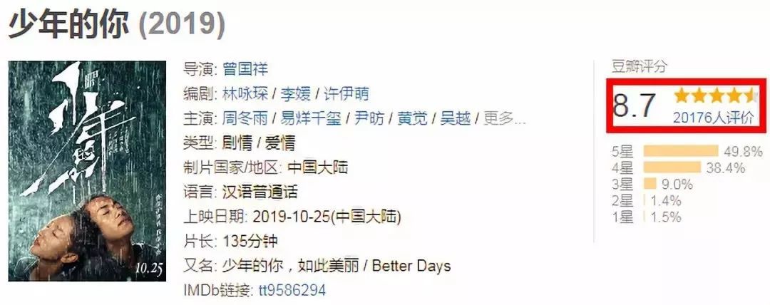 虽然最终定档十分仓促,但上映之后,无论是票房还是口碑,《少年的你》都收获了不俗的成绩。