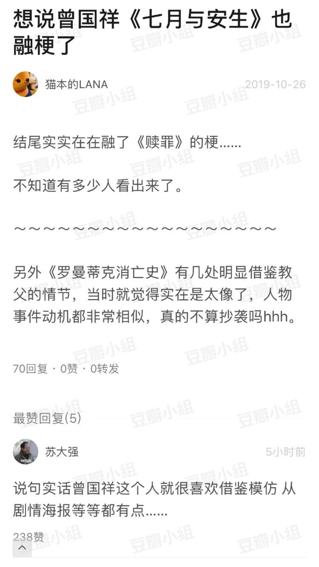 随后,有网友指出曾国祥的另一部作品《七月与安生》也涉嫌抄袭……