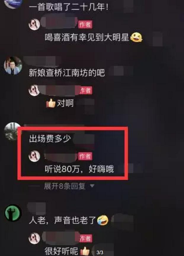 从曝光的画面可以看出,付笛生任静夫妇现场合唱不少歌曲,其中就有他们自己的成名曲《知心爱人》。有网友在网上晒出现场视频,非常意外地表示“喝喜酒有幸见到大明星”,还自曝付笛生任静夫妻的出场费高达80万。