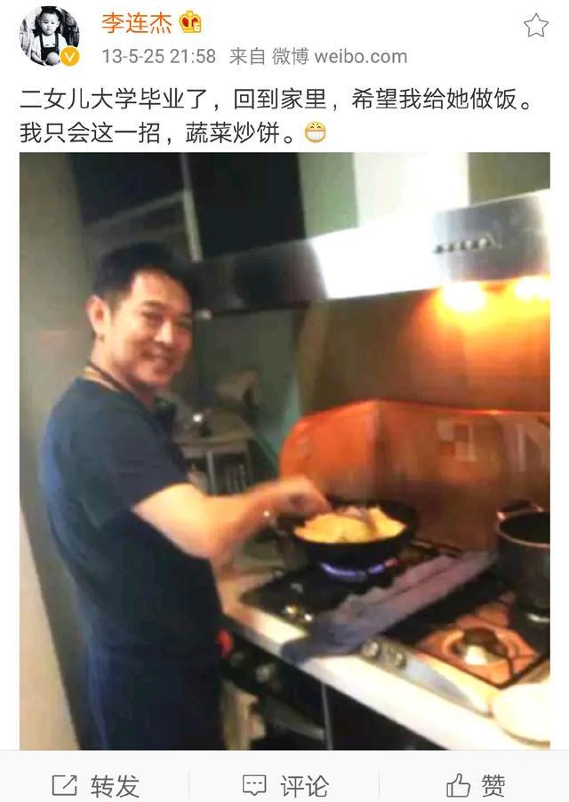 不过李连杰也不是全然没有提到前妻的两个女儿,2013年他就在微博晒照表示,二女儿大学毕业回家,希望自己做饭给她,李连杰还亲自下厨。