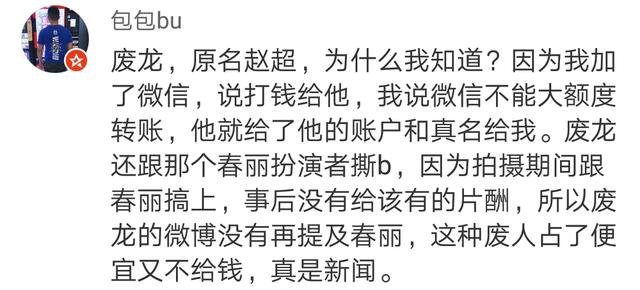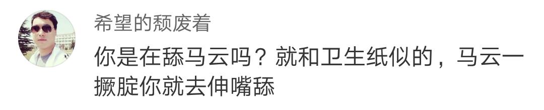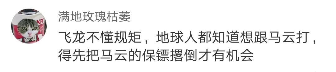 对此,网友们纷纷留言吐槽道:“你是在舔马云吗?就和卫生纸似的,马云一撅腚你就去伸嘴舔”、“飞龙不懂规矩,地球人都知道想跟马云打,得先把马云的保镖撂倒才有机会”、“人家不想理你还不敢和你打,这是新中国不是旧社会”、“他们不是不敢,是懒得嘲理你罢了,打倒你不是分分钟的事儿吗,拿着无知当个性”、“加油,就算别人都喷你,我也支持你。因为你是我见过最不要脸的人,总有一天,你能靠你这样厚脸皮出名的,加油,废龙”、“我们不能说脏话,说脏话会脏我们的嘴,我们要乐观,大声的笑出来就行哈哈”、“废龙,原名赵超,为什么我知道?因为我加了微信,说打钱给他,我说微信不能大额度转账,他就给了他的账户和真名给我。废龙还跟那个春丽扮演者撕逼,因为拍摄期间跟春丽搞上,事后没有给该有的片酬,所以废龙的微博没有再提及春丽,这种废人占了便宜又不给钱,真是新闻。”