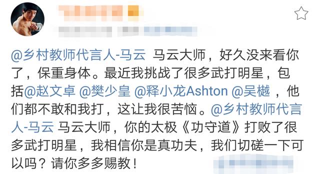 原标题:现代李小龙欲单挑马云:你打败了很多武打明星,咱俩打