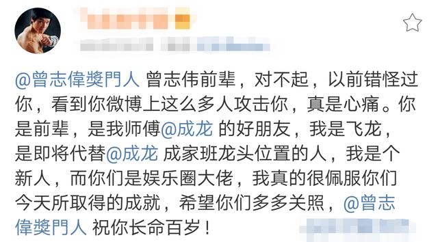 随即,飞龙又对香港著名演员曾志伟表达了钦佩之情:“曾志伟前辈,对不起,以前错怪过你,看到你微博上这么多人攻击你,真是心痛。你是前辈,是我师傅成龙的好朋友,我是飞龙,是即将代替成龙成家班龙头位置的人,我是个新人,而你们是娱乐圈大佬,我真的很佩服你们今天所取得的成就,希望你们多多关照,曾志伟,祝你长命百岁!”