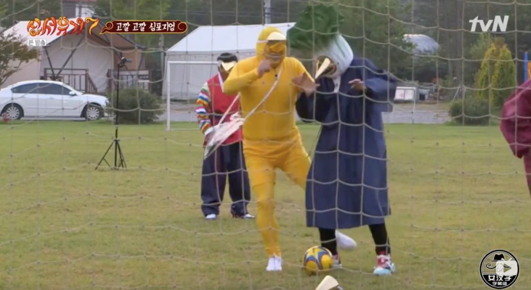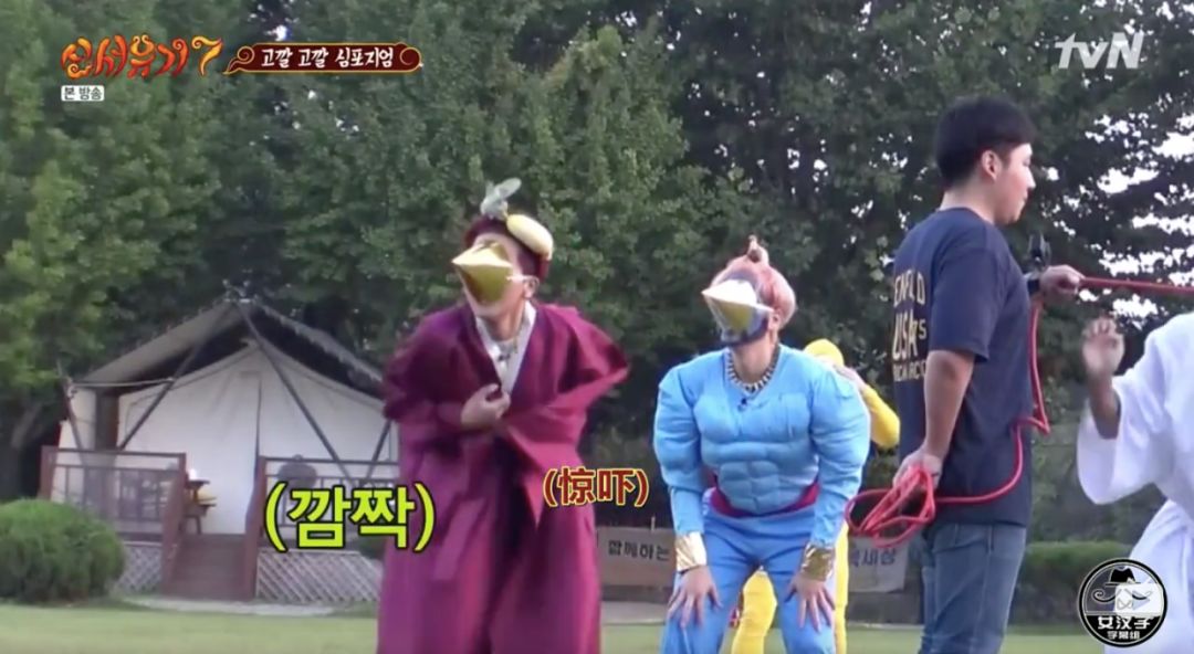 当然《新西游记》也不是完全不变,比如这一次的鸡嘴帽子游戏,大家不需要抢凳子,而是要踢球,于是姜虎东狠踢P.O的名场面就这样出现了。