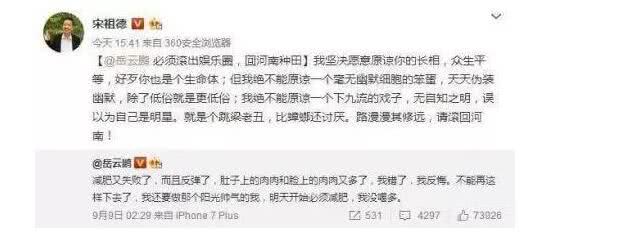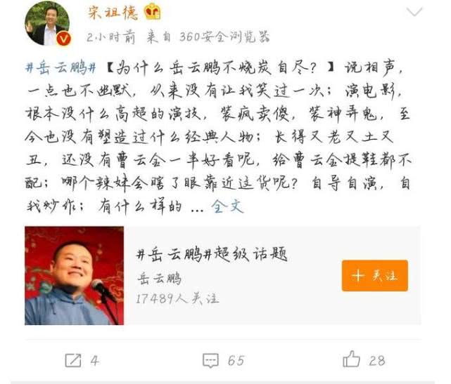 比如说之前他就发文称,要让岳云鹏滚出娱乐圈回河南种地,并且表示称,岳云鹏装幽默,除了低俗就是低俗。