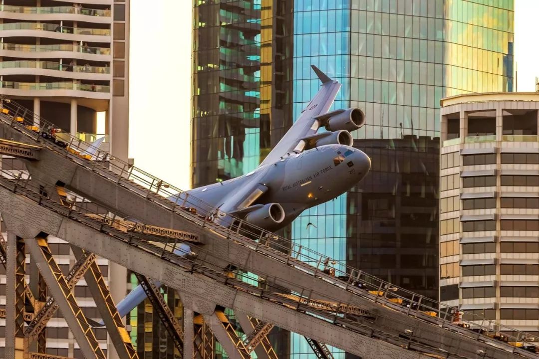布里斯班,文化节期间,一架货运飞机,从摩天大楼中穿行; ADRIAN WEDDERBURN/BAV MEDIA