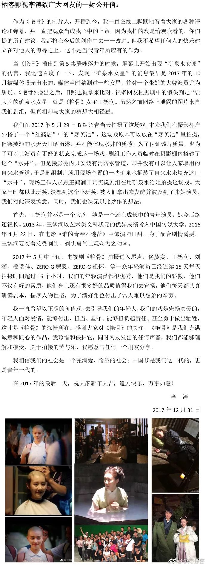 可是很快,演员嫌弃水脏逼迫剧组用矿泉水代替一事就有当事剧组出面澄清了。澄清信比较长,小8就捡重点来说吧,主要是以下几点:1、室外的取景地“寒天池”并不能体现井水这个水质,所以在室内临时搭景。2、临时搭景的室内并无水管,所以才用了桶装水代替。3、王鹤润并非大牌演员,没有特殊要求,在剧组中任劳任怨。