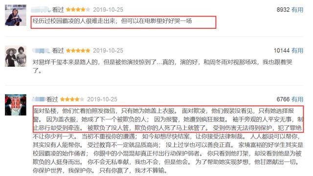 有观众感慨地说:经历过校园霸凌的人很难走出来,但可以在电影里好好哭一场。面对坠楼,他们忙着拍照发微信,只有她为她盖上衣服。面对欺凌,他们假装没看见,只有她选择报警。 因为盖衣服,她成了下一个被欺负的人;袖手旁观的人平安无事,制止恶行却受到牵连。正是这个引人深思的剧情,引起了无数父母和学校老师的热议,从而让无数网友持续关注。