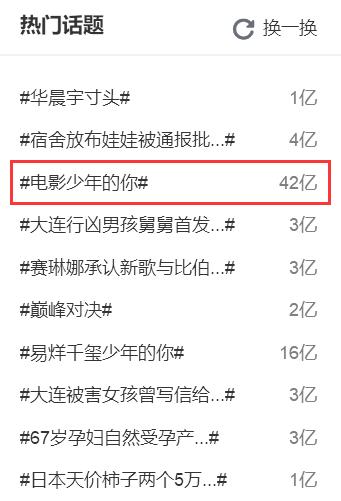 《少年的你》上热搜自然是可以预料到的,没想到热度竟然高达42亿。如果不太了解这个数据究竟有多高,可以看看其他热搜关键词的热度,易烊千玺凭借《少年的你》的出色表现也获得了16亿热度。而其他关键词达到数亿热度,已经非常难得。